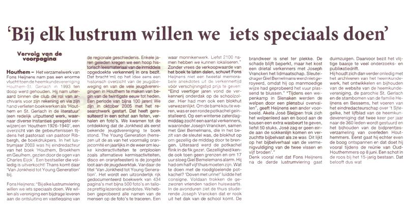 Gratis uitgave voor de deelnemers aan de reünie, met programma van 29 mei 2003, Houthemse historie in hoofdpunten, bijzonderheden over Houthem-St. Gerlach anno 2003, gegevens over de Charles Eijck-expositie, bijzondere service (oud-)Houthemers [genealogische gegevens, oude en nieuwe bidprentjes, literatuur over Houthem-Broekhem-Geulhem, inhoudsopgaven van het verenigingsblad 't Sjtegelke en de historische en heemkundige studies van het Geuldal], gegevens over het landgoed St. Gerlach [château, Gerlachuskerk, het kerkhof van Houthem, de nieuwe Gerlachuskapel, de beelden-, rozen- en kruidentuin en Ingendael], gegevens over de heemkundevereniging, deelnemerslijst Kunstkring Houthem en diverse foto's (o.m. van het bestuur van de heemkundevereniging, de lustrum- en reüniecommissie).